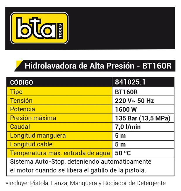 Incluye pistola completa, lanza, manguera de alta presión y recipiente para detergente.
